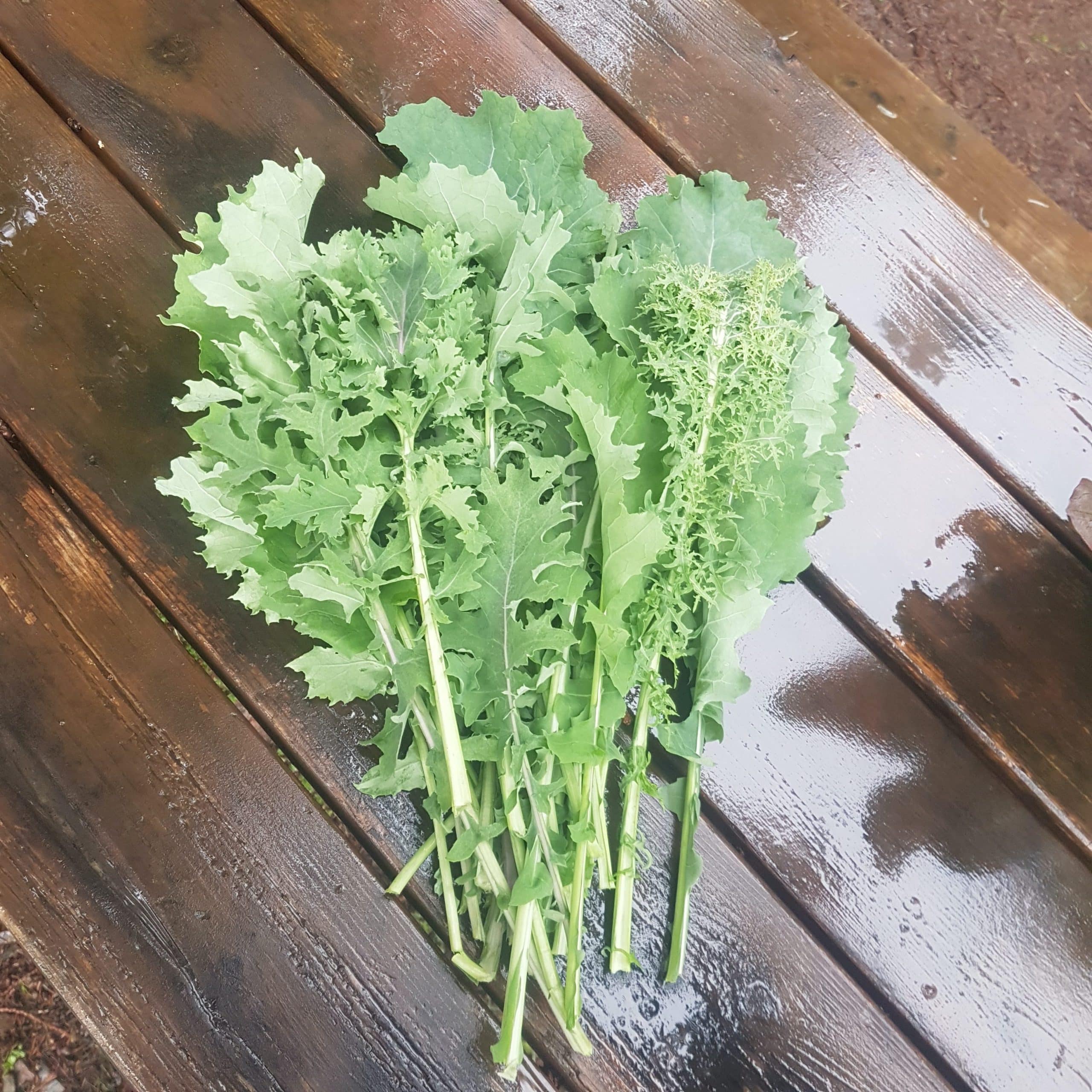 A medley of several different kales (Lacinato, Red Russian, Rainbow Lacinato, White Russian and Abundance), all very tender as they have been grown in the greenhouse over the winter.