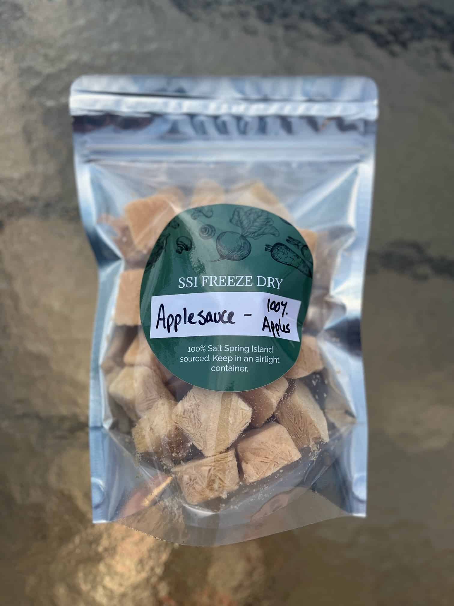 Crispy crunchy tart and delicious. Made from transparent apples grown on an old orchard tree on Byron Farm. Freeze dried apple sauce makes a wonderful snack for all (picky toddler approved!). Or rehydrate with a small amount of warm water until your desired consistency is achieved. Unsweetened, 100% apples, 100% Salt Spring. Keep in an airtight container.